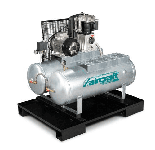 Universal compressed air station with 2 x 100 L compressed air tanks ready mounted on a safety stand pallet, space-saving and transportable
