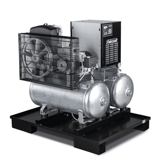 Universal compressed air station with 2 x 75 liter compressed air tanks ready mounted on a safety stand pallet, space-saving, transportable