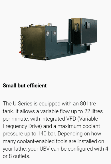 Chipblaster U-Series is a high pressure coolant system that can be installed under LNS barfeeders as a standalone unit. A solution for sliding headstocks, where floor space is limited.