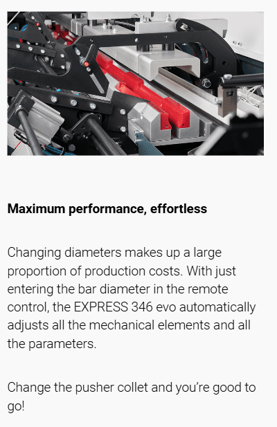 With its improved base and all-automatic guiding system, the EXPRESS 346 evo represents the next step in the integration of technology to speed up daily jobs, simplify tasks and reach a new level of productivity, for bars from dia. 3 to 46 mm.