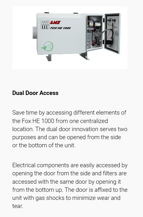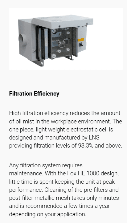 An electrostatic air filtration system with a sophisticated design and compact dimensions, the Fox HE 1000 offers a high level of filtration. Specially designed for small and medium-sized cabins operating with cutting oil, the Fox HE 1000 eliminates mists and fumes from machining operations to make your work environment cleaner, thus protecting the health of your employees and your investments from premature wear.