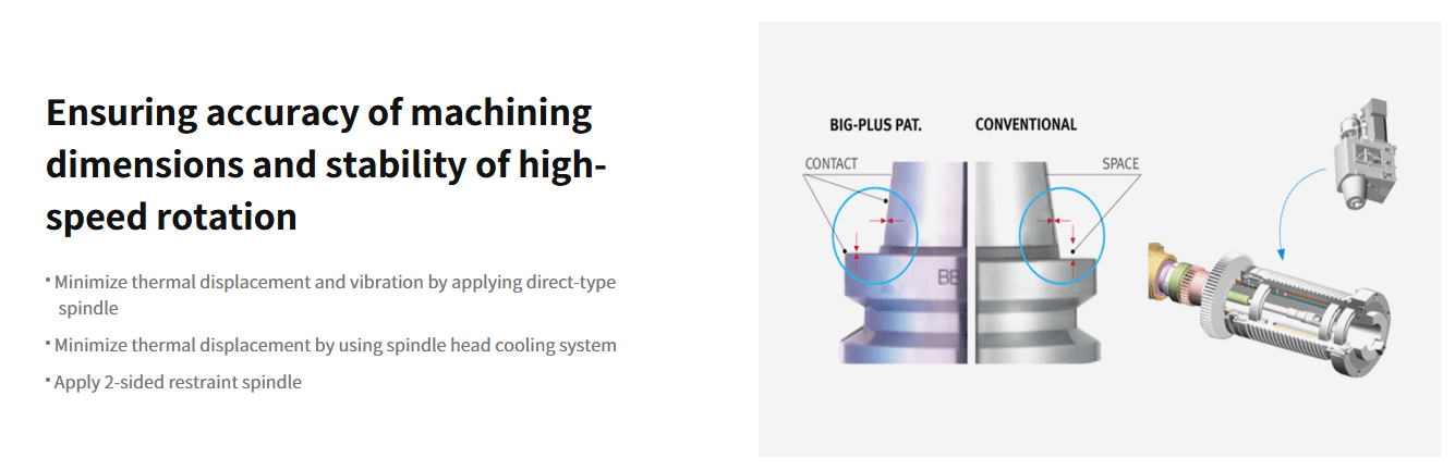 The efficiency and competitiveness achieved by the user is optimised by the core features which are standard on the machine. These include face / taper contact spindle nose (BBT40), effective spindle cooling system and air blower for chip removal when dry cutting. These features contribute to the machine’s capability to produce high quality dies and molds.
