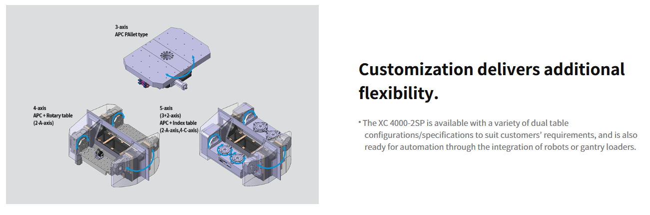The XC 4000-2SP twin-spindle vertical machining center is designed for high volume parts production. With two 12000r/min directly-connected spindles, the machine provides best-in-class high-speed machining productivity. The use of a mineral cast bed helps maintain stability and precision over long periods of time. The machine is also suitable for use with automated part-loading systems for unmanned running.
